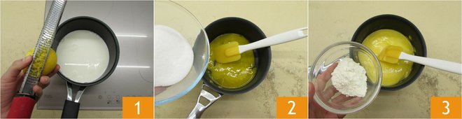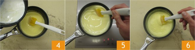 Bring the milk to a boil, then pour it gradually into the egg yolk, sugar, and flour mixture, and stir. Return to the heat, cook over medium heat 4 5 until the cream thickens 6.