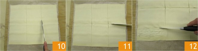 Cut the puff pastry into 3 equal parts vertically 10, then horizontally 11 to obtain 6 rectangles of about 4 x 4.5 inches. With a sharp knife (or a pasta cutter), make strips about 1/8 inch wide on half of the rectangle: leave a 3/8 inch border on the edge so as not to cut completely 12 and keep the strips attached to each other.