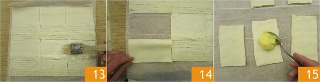 Brush the surface of the dough with half of the melted butter 13 and fold the rectangles over themselves, with the uncut part covering the cut part 14. Place a teaspoon of custard in the center of the folded rectangle 15.