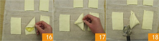 Bring one corner towards the center of the rectangle 16 and press the dough to adhere well 16. Bring the other corner towards the center to form a triangle 17. Use your fingers to press lightly, joining the two edges of the dough to maintain the shape during baking. Press well with your fingertips along the long side. Turn the sfogliatella over to the decorated side and trim if necessary with a cutter 18.