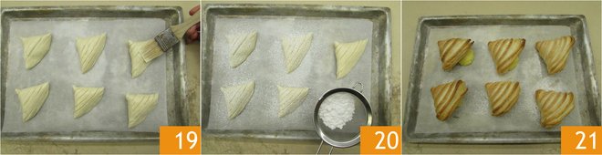 Place the sfogliatelle on a baking sheet lined with parchment paper with the closure facing down, brush the surface with the remaining melted butter 19 and sprinkle with powdered sugar 20. Bake in a preheated static oven at 390°F for about 15 minutes, or until golden brown. Remove from the oven and let cool 21 before sprinkling with more powdered sugar.