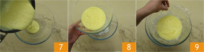 Pour the cream into a bowl 7 and place it in another bowl with ice to speed up the cooling process without losing the cream's shine and consistency 8. Cover with plastic wrap in contact with the surface and let it cool 9.