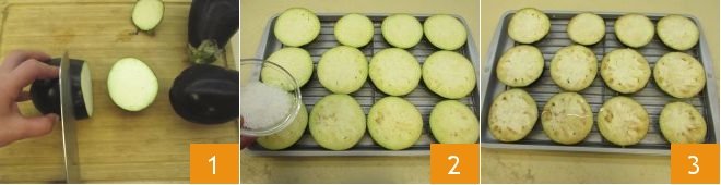 To prepare the eggplant cutlets, start by preparing the eggplants: wash them, trim both ends, and cut them into slices about 2/3 inch thick, until you get 12 slices. 1. Place all the slices on a rack and sprinkle each slice with coarse salt 2. Let them drain, at room temperature, for about an hour 3. For this step, it is advisable not to let the eggplants rest for more than 1 hour and a half, otherwise, they will absorb too much salt.