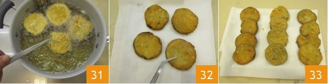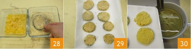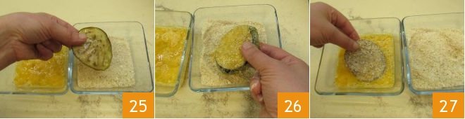then into the mixture of breadcrumbs and Pecorino cheese 25, first on one side and then on the other 26. Again, make a double breading: dip the eggplant in the egg 27