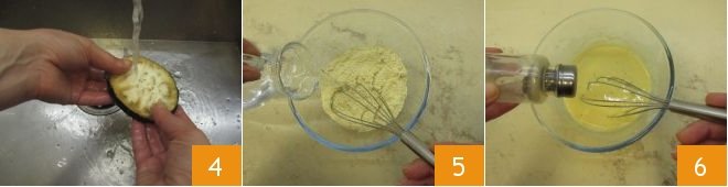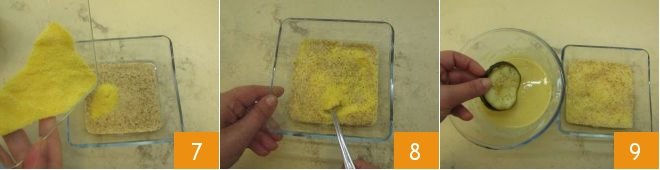 Now in another bowl, pour the breadcrumbs and fine cornmeal 7, and mix well to combine the two ingredients 8. Take an eggplant slice and dip it into the chickpea flour and water batter 9