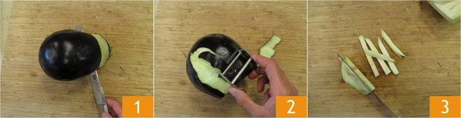 To prepare eggplants in oil, make sure to sanitize the jars as indicated at the end of the recipe and use new lids (follow the instructions by the Ministry of health on preparing home made preserves). Wash the eggplants well under running water, dry them, trim them 1, peel them to remove the skin 2, and cut into 1/2-inch sticks 3.