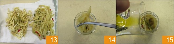 Let cool slightly 13. Transfer the now-lukewarm eggplants into 2 perfectly clean and dry 17 fl oz glass jars 14. Completely cover the eggplants with extra virgin olive oil, making sure to leave a one-finger space from the edge 15.