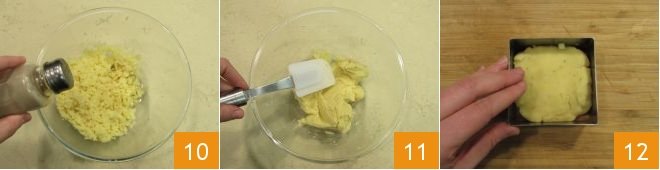 Salt and pepper the potatoes 10; work the potatoes with a spatula 11, then take a 4-inch square ring mold and place half the amount of puree inside it 12,