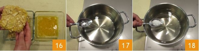 Once finished 16, set the squares aside. Move on to preparing the poached eggs. In another pan, pour water, leaving about 1.5-2 inches from the top. Add 1 tablespoon of white wine vinegar 17. Turn the heat to medium and add coarse salt 18.