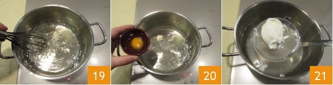 Turn on the heat, warm everything up, and whisk vigorously 19, create a whirlpool into which you should pour the egg 20. Use a slotted spoon to ensure the white completely covers the yolk; it will take about 4-5 minutes to cook. Then gently drain the egg 21 and proceed with the other. Keep the poached eggs aside.
