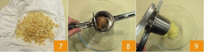 until you get coarse crumbs 7. In another small bowl, pour the eggs and lightly beat them. Set aside; now that the potatoes are cooked, while still warm, mash them (8-9) (if you don't have a potato masher, peel them and use a food mill or a fork).