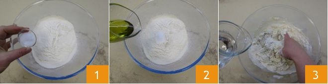 To prepare the erbazzone or scarpazzone, start with the dough: sift the flour into a bowl, then add the salt 1, the oil 2, and the lukewarm water 3;