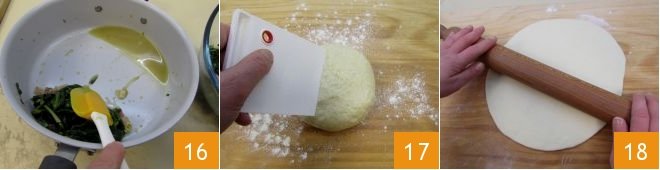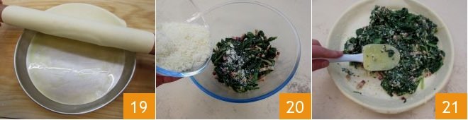 then remove the excess water 16 and place the cooked chard in a large bowl, letting them cool. After the necessary time, take the dough out of the refrigerator, place it on a lightly floured work surface and with a dough scraper take 12.3 oz of dough 17: this will serve as the base. With the help of a rolling pin, roll out a sheet with a diameter of 14 inches 18 and another of the same size but thinner with the remaining dough.