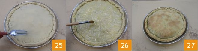 then pierce the surface with the tines of a fork 25 and brush with olive oil 26. Bake in a preheated static oven at 390°F for 30 minutes (or at 355°F for 20 minutes if in a convection oven). Once ready 27, remove from the oven and serve your erbazzone or scarpazzone.