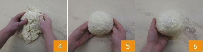 knead with your hands 4 until you get a smooth and homogeneous dough. Form a ball 5, wrap it in plastic wrap 6 and let it rest in the refrigerator for at least 30 minutes.