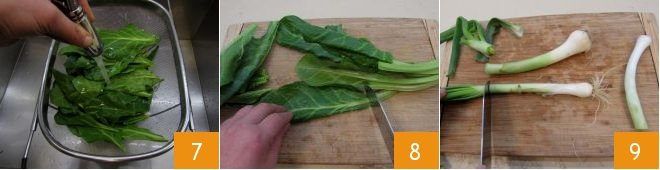 In the meantime, take care of the filling: wash the chard under plenty of cold running water 7, dry them, and remove the stem 8; clean the green onions 9,