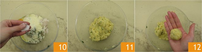 Adjust with salt 10 and pepper. Mix well to combine everything 11 and form walnut-sized balls with about 30 g of mixture with your hands 12.