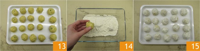 Place the meatballs on a tray as you go, you will get about 20-25 13. Then pass them in the flour 1415.
