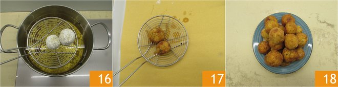 Fry the meatballs, 2 or 3 at a time, in well-heated vegetable oil, at about 340°F, for about 3 minutes. When the meatballs are golden, remove them from the oil with a slotted spoon 16 and place them on paper towels 17 to dry the excess oil. Enjoy the fish meatballs hot or warm 18!