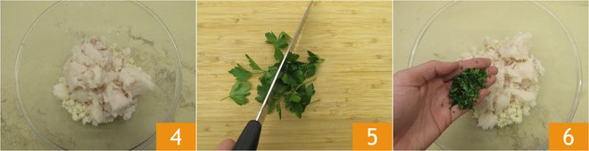 Mix the chopped cod with the bread in a bowl 4. Wash and chop the parsley 5, then add it to the bowl 6 along with the thyme.