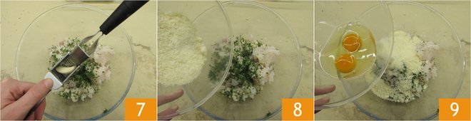 Season with the crushed garlic 7 and grated cheese 8. Then incorporate the two eggs 9.