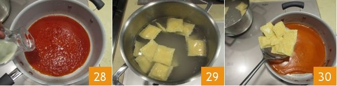 In the meantime, now that the sauce is ready, pour the fresh liquid milk into the pan 28, stir and cook for another couple of minutes on a low flame; when the ravioli float to the surface 29, drain them and add them to the sauce straight away 30.
