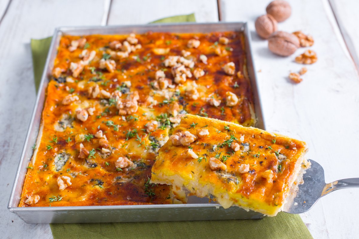 Our recipe for four-cheese quiche will give you exactly what you’d expect from this dish – and maybe even more: An irresistible creamy, tasty combination of flavors, with a hint of herbs. Our four cheese musketeers in this case are Roquefort, Taleggio, Gruyere, and Grana Padano, sagely combined to form a quiche with an intense, unmistakable taste, perfect for palates that don’t shy away from strong flavors. This enticing savory tart is perfect for a fall menu: Cut it into bite-sized cubes and serve as part of a buffet as a tantalizing appetizer, or enjoy it in its own right as a second course dish!