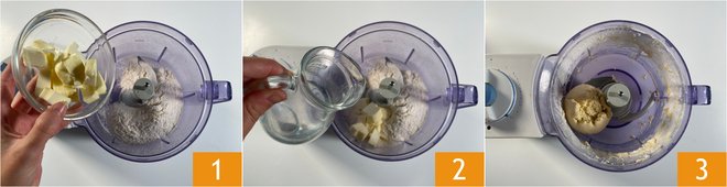 To make the four-cheese quiche, start with the pie dough: Add the flour, cold butter cut into cubes 1, ice water 2, and salt to the bowl of a food processor and blitz for just a very short time: As soon as the mixture has come together in a mass, the dough is ready 3.