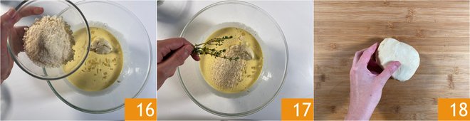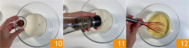 nutmeg 10, pepper 11, and a pinch of salt (bearing in mind that the cheeses are already very flavorful) to a bowl, and whisk together 12.