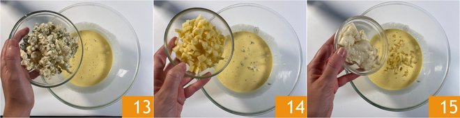 Then add the Roquefort 13, Gruyere 14, Taleggio 15,