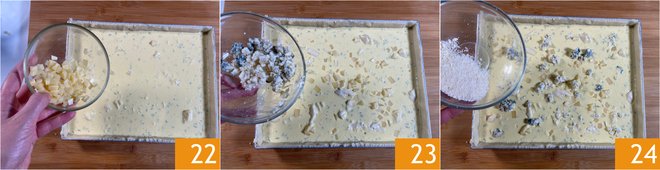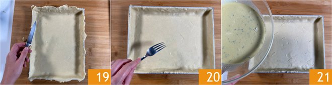 Arrange the dough in a pie dish, which doesn’t have to be greased. Make sure the dough is stuck to the dish well, trim the edges 19 and prick the bottom using a fork 20, then pour in the cheesy filling 21.