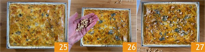 Once it’s finished cooking 25, sprinkle with chopped walnuts 26 and some more thyme leaves, and then your four-cheese quiche is ready to be served 27.
