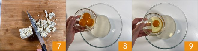 and Roquefort 7 cheeses into cubes. Next, place the heavy cream, egg yolks 8, whole egg 9,