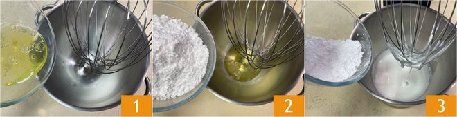 To prepare the French meringue, first separate the egg whites from the yolks. The eggs must be very fresh and at room temperature. For this recipe, you will only need the egg whites; you can use the yolks to make a great custard). Put the egg whites in the bowl of a stand mixer fitted with a whisk 1, making sure there are no traces of yolk, otherwise they won't whip. Add half of the icing sugar 2 and start the mixer at medium speed. After a few minutes, stop the machine, add the remaining half of the icing sugar 3, and continue to whip at medium speed.