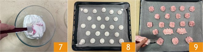 Add food coloring as desired and mix 7. Transfer everything into a piping bag and squeeze out dollops onto baking sheets lined with parchment paper, making sure to space them well apart; this way, air can circulate and cook them evenly. Use smooth or star-shaped nozzles to create meringues of different shapes 8 9.