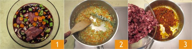 To prepare fresh egg pasta with boar ragu, start by making the sauce: prepare the ragu by following our recipe. Marinade the meat with the vegetables in 2.5 cups of wine for 12/24 hours 1. Finely chop aromatic herbs and add tomato paste 2, then cook the meat for around 2/3 hours; add around 0.4 cups of wine and the vegetable broth, simmer and reduce 3.