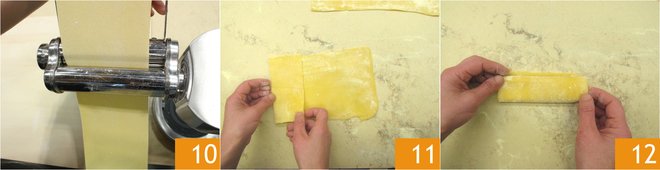 Sprinkle abundant flour over one piece and flatten it; do not remove the other pieces from the plastic wrap, otherwise they will dry out. Take the pasta making machine and set it to thickness level 1, the thickest setting, and feed the dough through the rollers 10: at first the pasta sheets will be quite thick. Fold both edges of the dough inwards to create a more regular shape, then lightly sprinkle with flour and feed it through the rolls once more; repeat several times until you reach thickness setting number 8. Place the resulting pasta on a pastry board dredged with flour and trim the edges with a spatula (or a knife), sprinkle both sides with a little flour and leave the sheets to dry for 5 minutes on each side. Take a pasta sheet, fold one edge over by around two thirds 11 and start shaping it 12 into a very flat roll, with the closed end up.