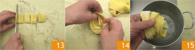 Cut the pasta roll into 0.8" - 1.6" thick slices 13. Take both ends of the pasta and spread it over your hand, roll it around your fingers to form a nest, then place it on the pastry board sprinkled with flour 14. Continue until you finish all the dough. Cook the pasta in boiling salted water 15 for 4-5 minutes.