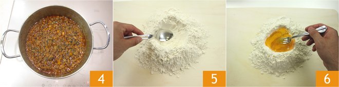 While the ragu is cooking 4, prepare the fresh egg pasta: place the flour on a pastry board and form a well 5. Break open the eggs at room temperature and place them in the middle. Now beat with a fork 6.