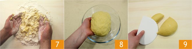 As soon as the eggs absorb some of the flour, start kneading by hand 7 into a homogeneous dough. Roll it into a ball 8 and wrap in plastic wrap, or cover with the bowl. Leave the dough to rest at room temperature for at least 1 hour. Split it into three parts 9 so that it is easier to roll out.
