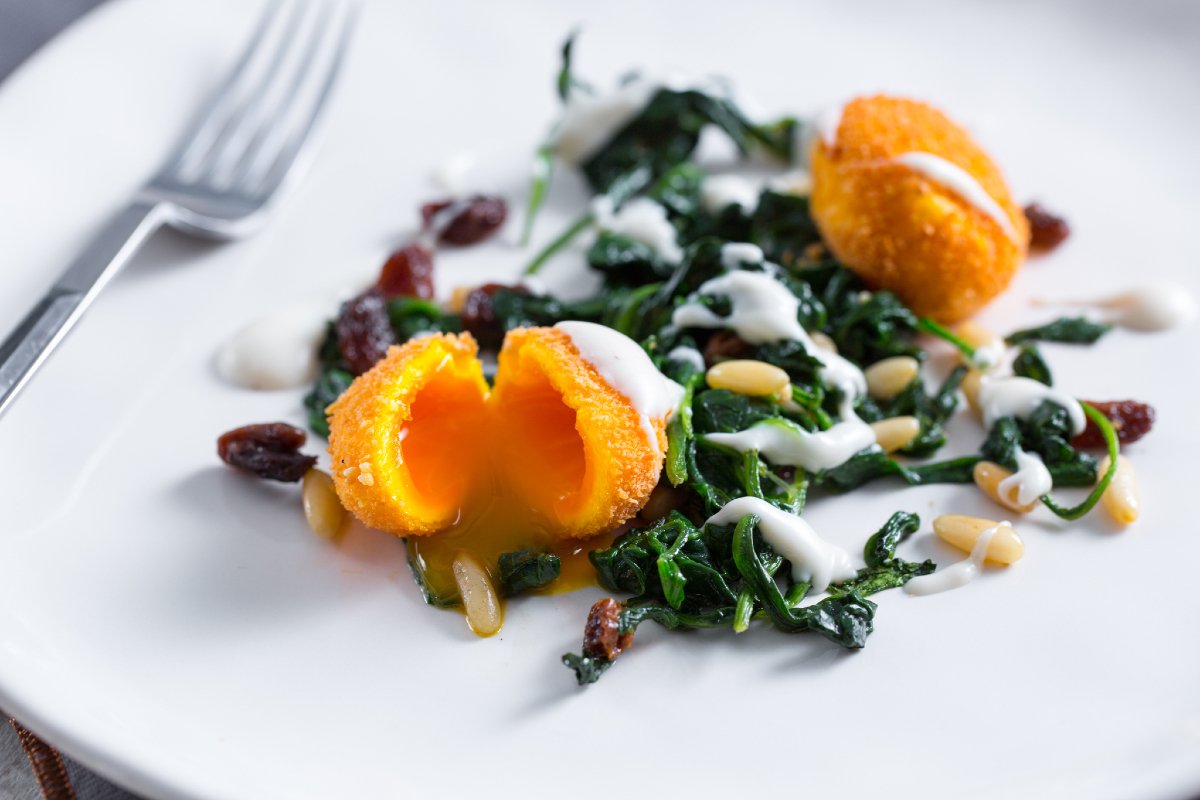 If you are looking for a delicious and original recipe, well you've come to the right place... we're going to show you how to make fried egg yolk! The perfect base preparation for enriching lots of dishes, starters, first and second courses, just like the one we present you with today. If you're wondering how to fry a yolk without breaking it, the answer's simple. Simply coat it in breadcrumbs and freeze it: it will be far less delicate and much easier for you to immerse it in the oil. Once cooked they'll be crispy on the outside and soft on the inside. Be careful not to cook them for too long otherwise you'll lose this characterizing effect. Here's a serving suggestion: place them on a bed of spinach, enriched with raisins and pine nuts, and a black pepper béchamel to enhance all their flavor!