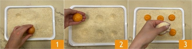 To prepare fried egg yolk, start by placing abundant breadcrumbs on a plate, or a tray. Use an egg to dimple the breadcrumb surface several times 1. Place the first yolk in one the dimples 2 and repeat with all the others. Coat them in breadcrumbs 3.