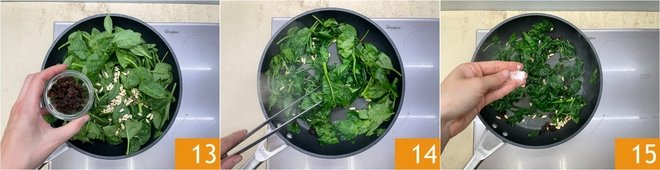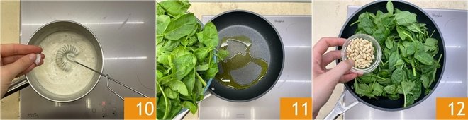 Add a pinch of salt 10, stir and leave to one side. Now prepare the spinach. Wash and dry it thoroughly. Place it in a pan where you will have already heated a drizzle of oil. Add the pine nuts 12.