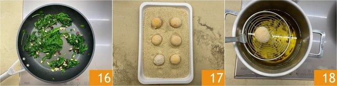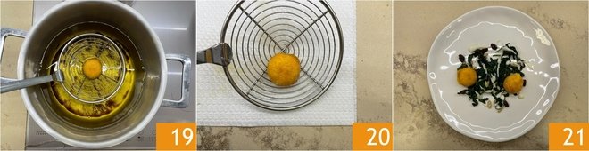 Cook for around 3-4 minutes until the spinach has nicely wilted 16. Now get ready to fry: pour the seed oil in a saucepan and heat to 356°. Remove the yolks from the freezer 17 and immerse them in the hot oil one at a time 18.