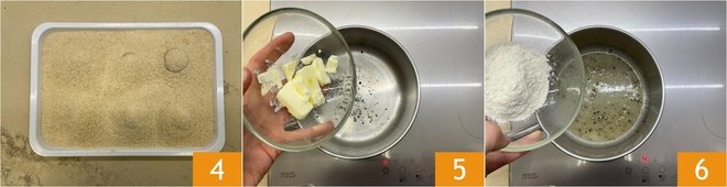 The yolks must be thoroughly covered; leave them in the freezer for at least 2 hours 4. Start preparing the béchamel once the 2 hours are up. Place an abundant grating of black pepper in a saucepan and toast for a couple of minutes on a low flame. Add the butter 5 and melt it, then add the flour all in one go 6.