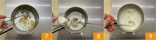 Stir briskly with a whisk 7 to make the roux, and cook for a couple of minutes. Now add the milk 8 and stir some more. Cook until it starts to thicken 9.