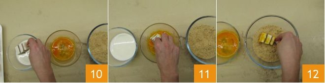 Pass the skewers first in milk 10, then in beaten eggs 11, and finally in breadcrumbs 12.