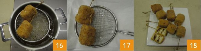 Proceed to the double breadcrumbs dipping once again the skewers already breaded first in eggs 13 and then in breadcrumbs 14. Heat the peanut seed oil in a pan to 300° F (150° C). Fry a few pieces at a time 15 to avoid overheating the oil.