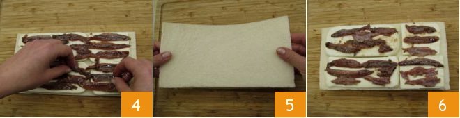 Lay some anchovy fillets 4 and cover with another slice of bread 5. Continue with slices of mozzarella and anchovy fillets 6.