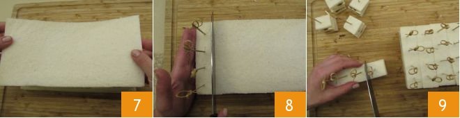 Close with another slice of bread 7. Now you can skewer the shorter side with 4 skewers to obtain the first 4 skewers (8-9) and continue like this until everything has been used.